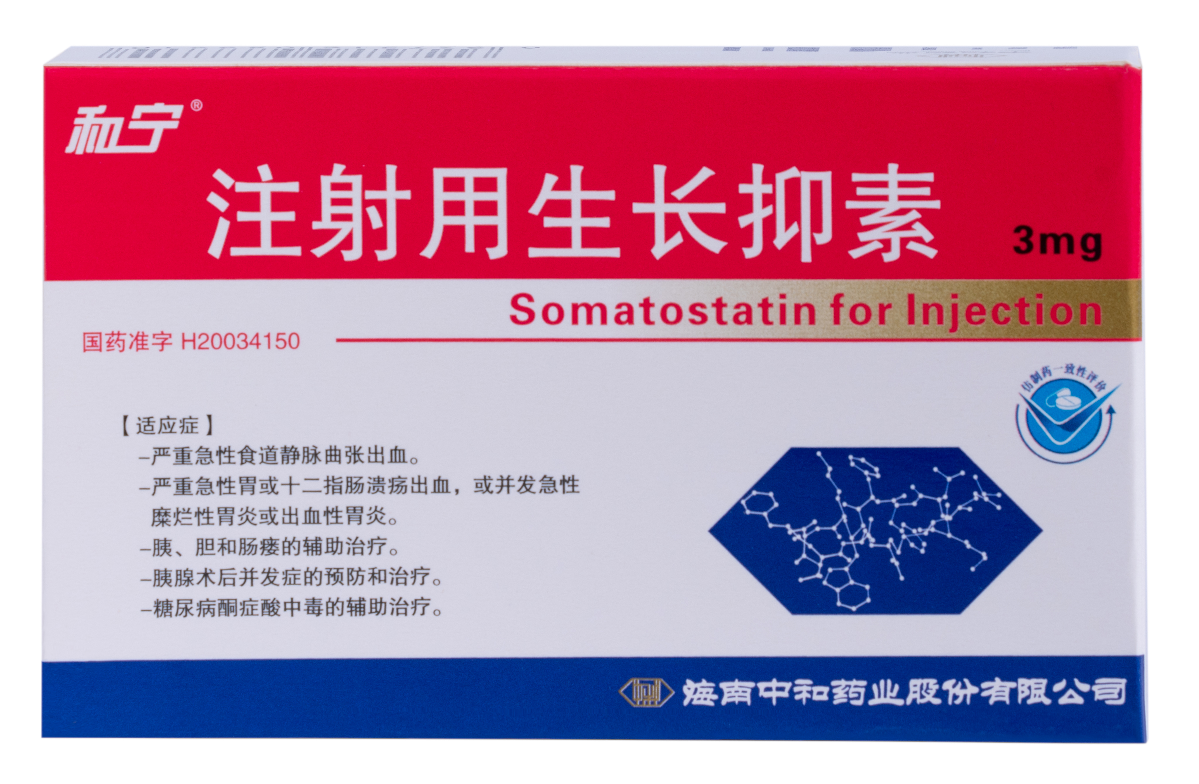 生長(zhǎng)抑素是人工合成的環(huán)狀十四氨基酸肽,其與天然生長(zhǎng)抑素在化學(xué)結(jié)構(gòu)和作用機(jī)理上完全相同。