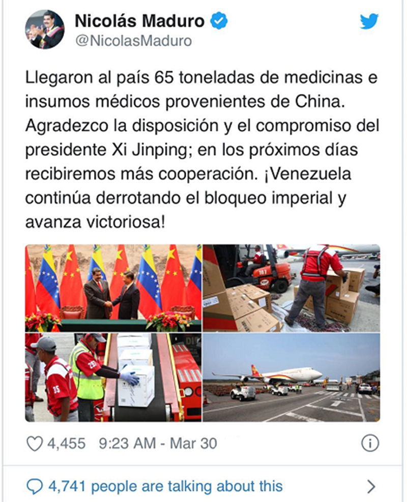 委內(nèi)瑞拉外長阿雷亞薩、衛(wèi)生部長阿爾瓦拉多、經(jīng)濟和財政部長塞爾帕以及中國駐委大使李寶榮等到機場迎接。委內(nèi)瑞拉總統(tǒng)馬杜羅在電視講話中和個人推特賬號上表示“這是真正的人道主義援助,感謝中國政府和人民對委人民的支持。”