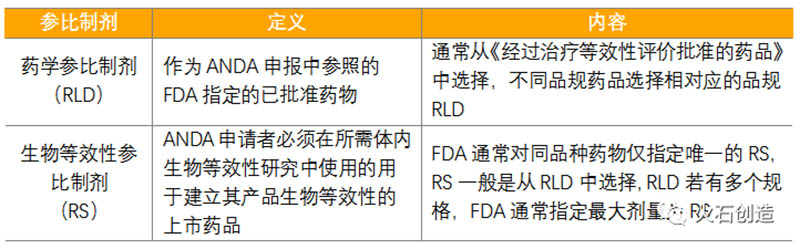 為了避免仿制藥與原研藥在療效上出現(xiàn)偏差,F(xiàn)DA規(guī)定了相同化學(xué)成分藥物的參比制劑,仿制藥只能將該參比制劑作為評價體內(nèi)或體外治療等效性的標(biāo)準(zhǔn)藥物。仿制藥與參比制劑應(yīng)具有相同的活性成分、劑型、規(guī)格、給藥途徑和說明書。FDA將仿制藥參比制劑分為藥學(xué)參比制劑(reference listed drug,RLD)和生物等效性參比制劑(reference standard,RS)。