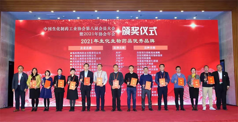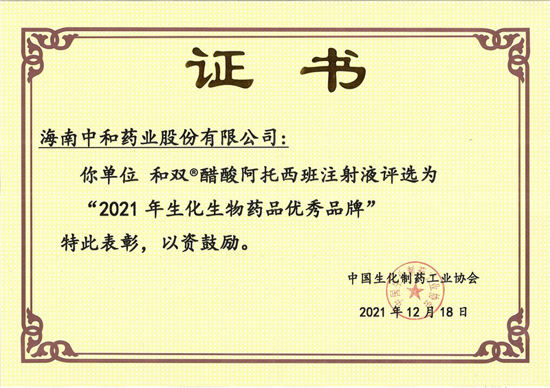 2021年12月18日,在北京召開(kāi)的“中國(guó)生化制藥工業(yè)協(xié)會(huì)第八屆會(huì)員大會(huì)暨2021年協(xié)會(huì)年會(huì)”上,海南中和藥業(yè)產(chǎn)品和雙?醋酸阿托西班注射液榮獲“2021年生化生物藥品優(yōu)秀品牌”稱號(hào)。