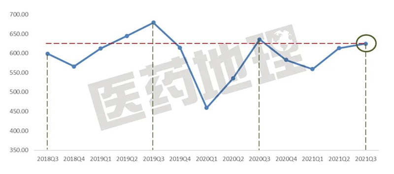 基于PDB國內(nèi)樣本醫(yī)院市場數(shù)據(jù),2021年前三季度共實現(xiàn)銷售額約1797億元,相較于2020年同期回升10.24%。雖然2020Q1是近三年來的最低點,但2021Q3卻成為近兩年的三季度最低點,Q2到Q3的環(huán)比提升僅1.86%。如果按照往年的Q4季節(jié)性回落推算,2021年全年市場銷售額仍與2019年有著不小的差距。