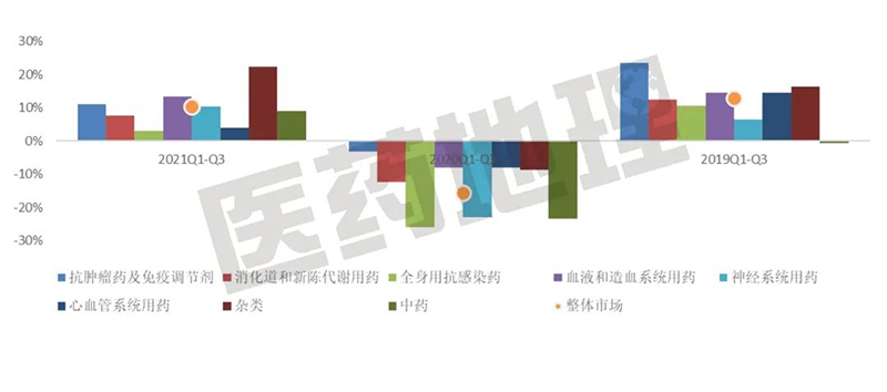 圖2樣本醫(yī)院市場TOP8治療類別近年增長趨勢(2019Q1-Q3,2020Q1-Q3,2021Q1-Q3)