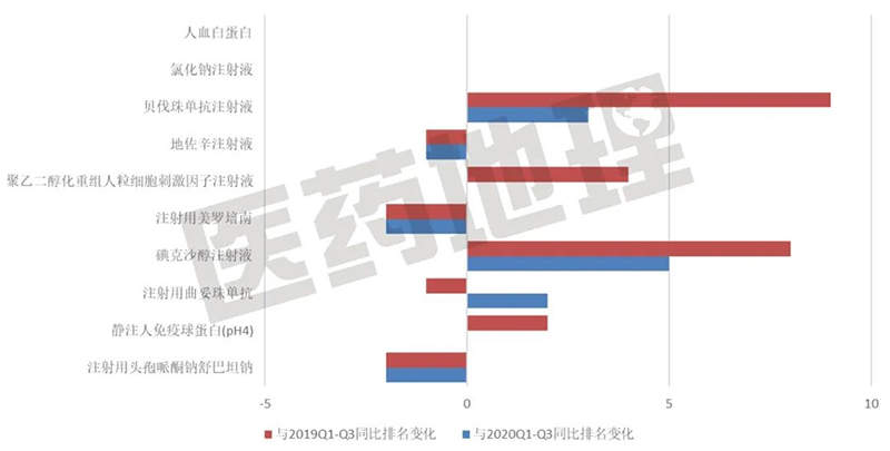 圖3樣本醫(yī)院市場TOP10產(chǎn)品排名變化(2021Q1-Q3)
