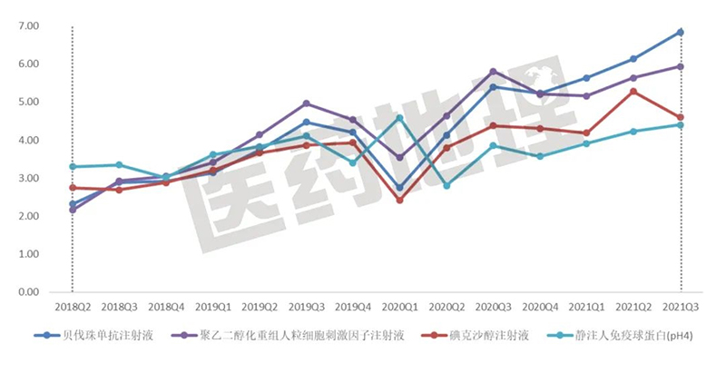具體來看,近三年間排名只升不降的有4個產(chǎn)品,競爭非常激烈。在2018年二季度時,4個產(chǎn)品的排名依次是靜注人免疫球蛋白、碘克沙醇、貝伐珠單抗和粒細胞刺激因子,季度銷售額最大差距為1.14億元;但到了2021年三季度,排名已經(jīng)變成了貝伐珠單抗、粒細胞刺激因子、碘克沙醇和靜注人免疫球蛋白,季度銷售額最大差距擴大至2.44億元。未來或有新產(chǎn)品入局。