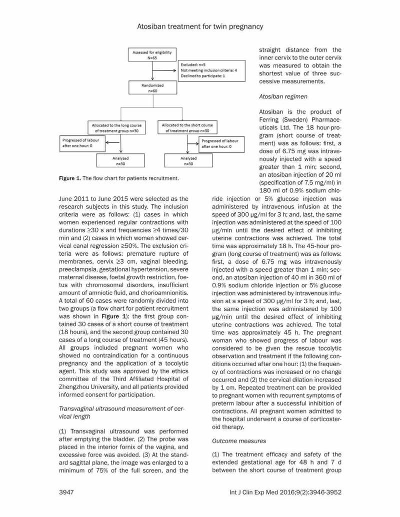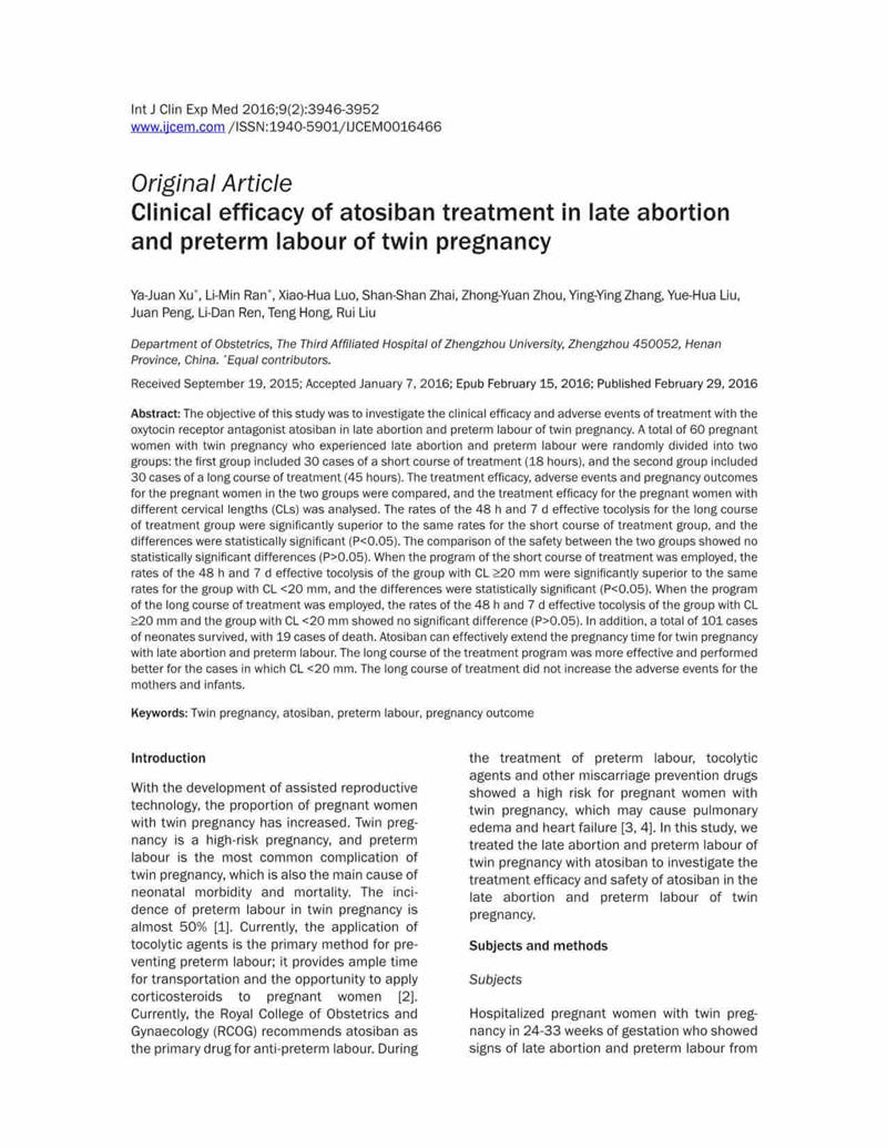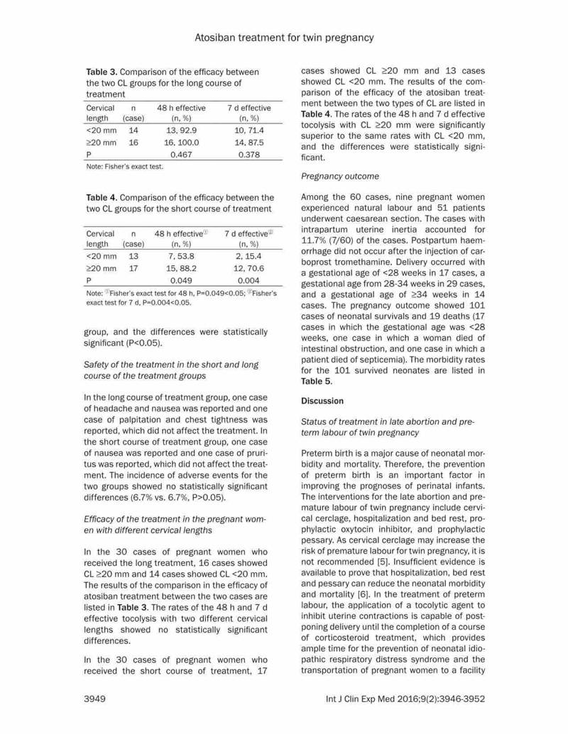 結(jié)論:阿托西班可有效延長晚期流產(chǎn)以及早產(chǎn)的雙胎妊娠的妊娠時(shí)間。對于宮頸長度<20mm的病例,長療程治療更有效,效果更好。長期治療不會(huì)增加母嬰的不良反應(yīng)。