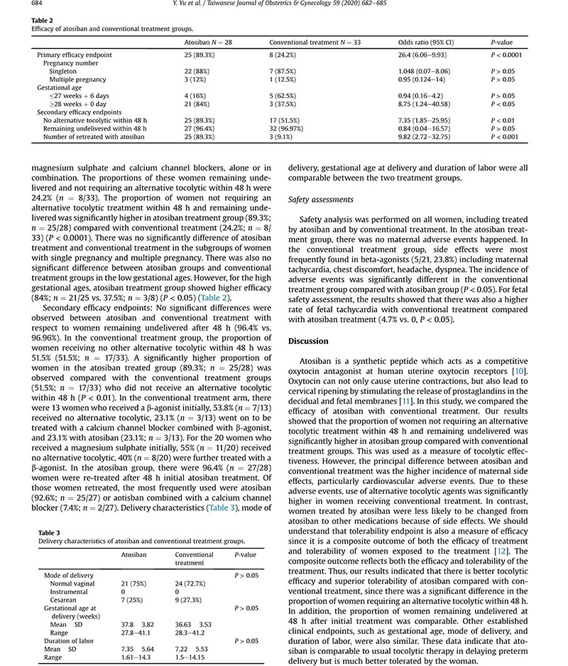 結(jié)論:我們的研究結(jié)果支持阿托西班對比目前常規(guī)治療是更為先進(jìn)的宮縮抑制劑,尤其是對于高孕齡者。